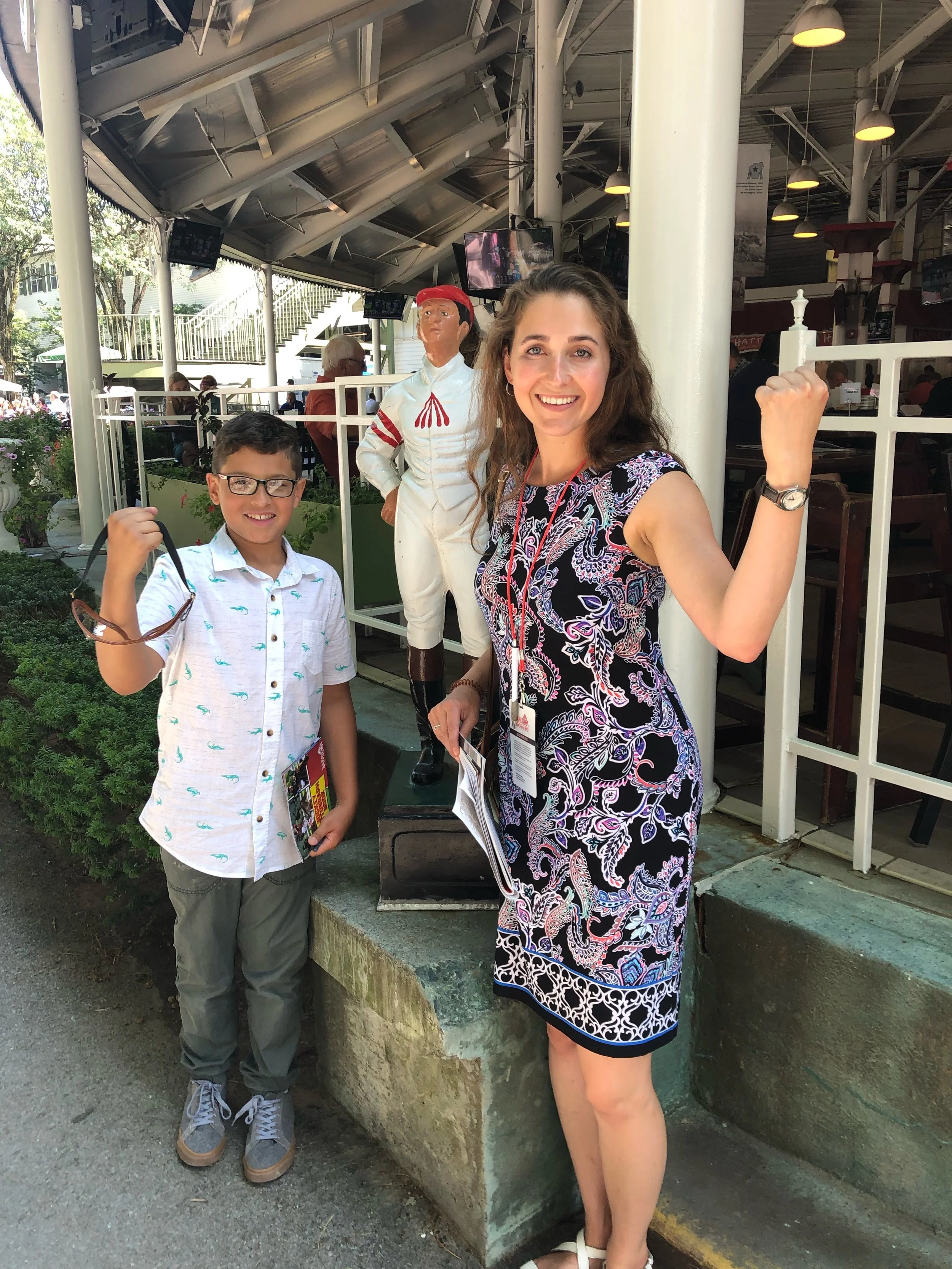 Posing with a lawn jockey after acquiring a pair of jockey goggles from top rider Luis Saez.